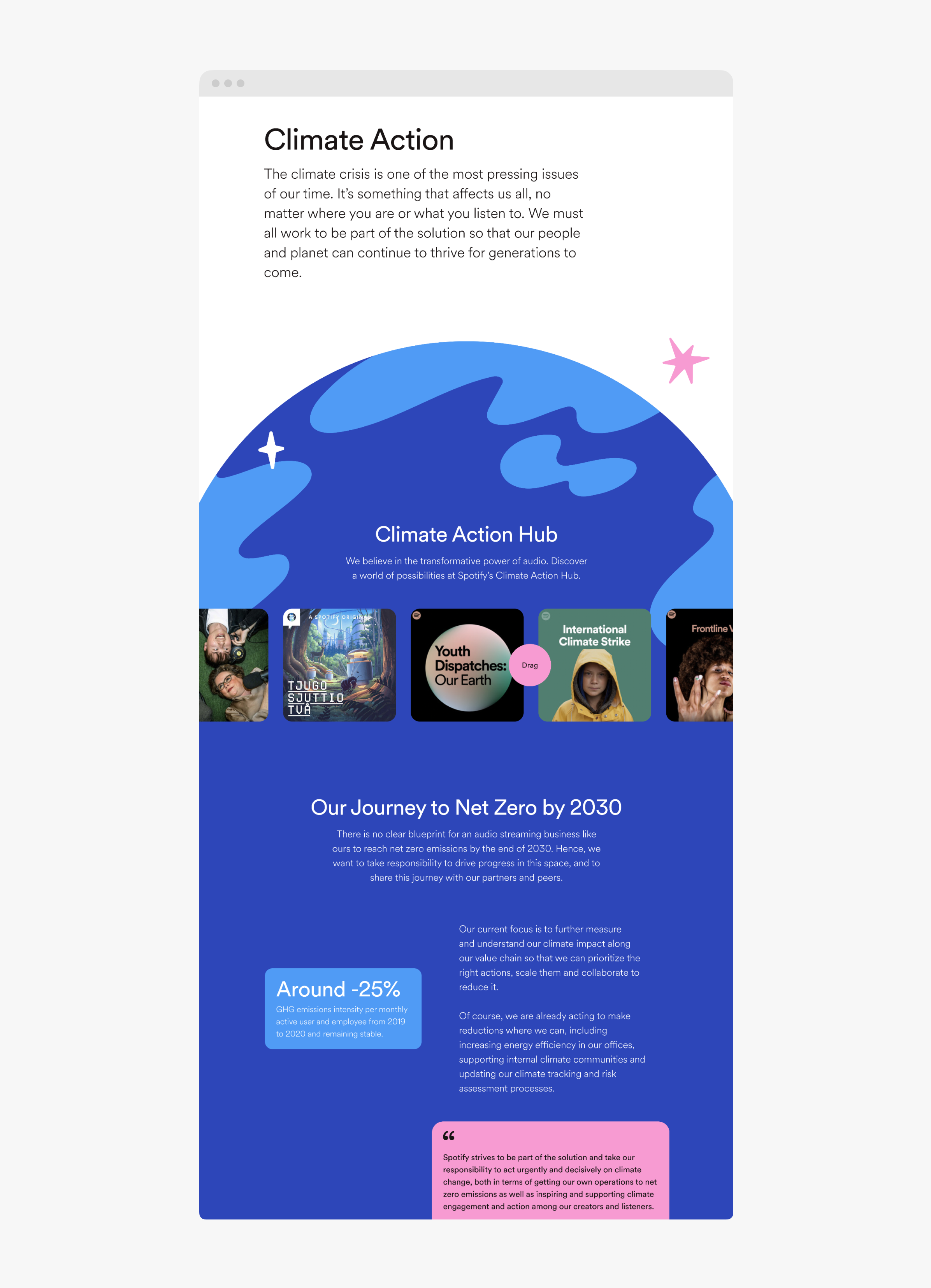 We helped Spotify bring their DEI commitments to life through a dedicated microsite aligned with their annual Sustainability & Social Impact report.